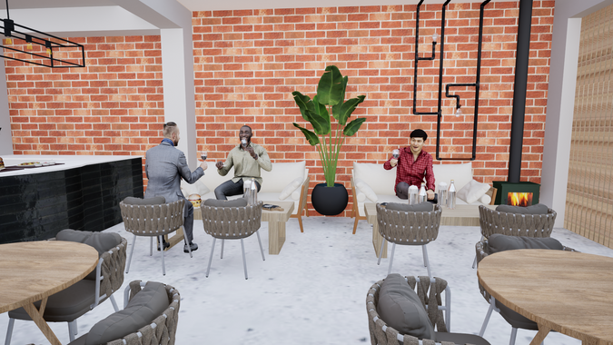 This brewery features a modern, industrial aesthetic with exposed brick walls, large windows that bring in natural light, and sleek, black ceiling fixtures. The bar area has a minimalist feel, with a light wood countertop, black tile base, and simple wooden barstools, creating an inviting communal space. Pendant lights hang above the bar, providing focused lighting. The seating includes a mix of high bar chairs, cozy armchairs, and lounge sofas, offering a comfortable, relaxed atmosphere for patrons. The design balances warmth and modernity, making it a welcoming yet stylish setting for social gatherings
